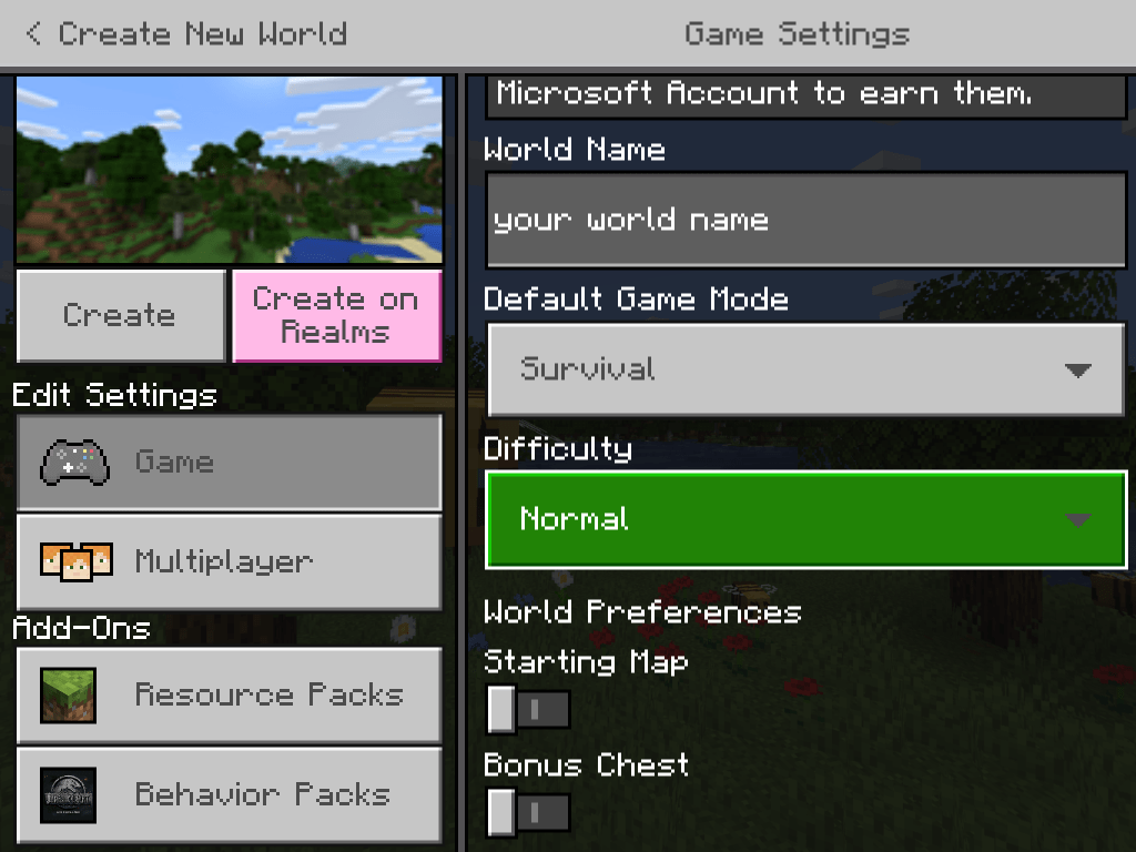 For Minecraft pocket edition (bedrock edition): In the worlds tab, press create new. In the templates tab that opens up,click on click on create new world (ignore the templates). Once you’re in the game settings page click the game option on the right. On the left, make sure that your game mode is set to survival mode and difficulty should be set on normal or easy depending on how confident you are. Starting map and bonus chest should be off.
