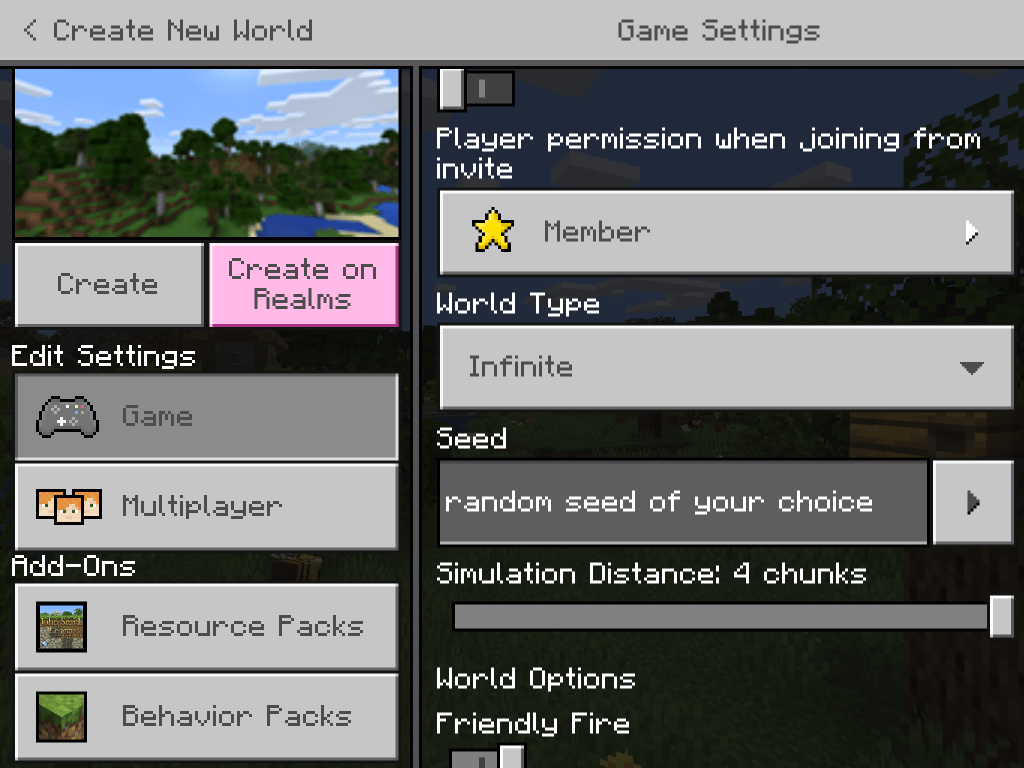After entering a random seed, set the world type to infinite and the simulation distance to 4 chunks. Scroll down to the world options and set them as shown below: