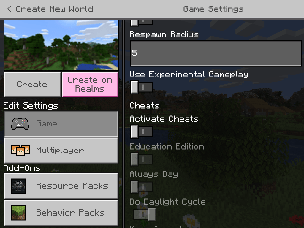 Also make sure that activate cheats is off. This is very important because if you activate cheats, your achievements will be permanently turned off (also turn off experimental gameplay to avoid glitches and bugs). Achievements are an important aspect to the game so be sure to turn off cheats.